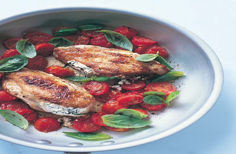 Preheat oven to 160°C (320°F). Combine ricotta, shredded basil and parmesan. Carefully loosen the skin from the chicken breast, leaving ends intact and carefully spoon in ricotta mixture.